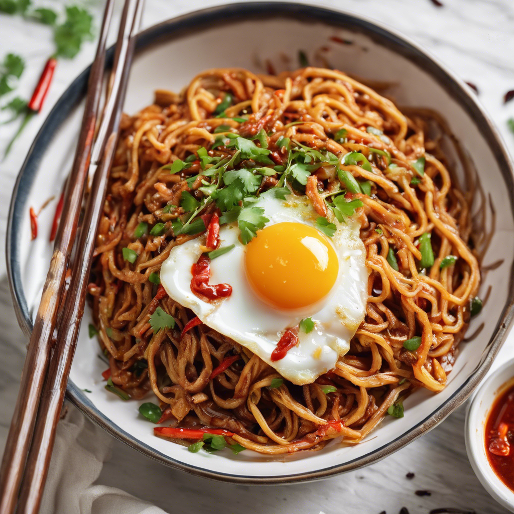 - Serve immediately and enjoy the spicy Szechuan noodles with a crispy fried egg on top!