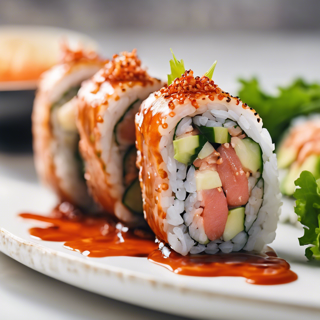The Spicy Tuna Caterpillar Roll with a spicy mayo drizzle is a modern twist on the classic Japanese sushi roll. This innovative dish originated in the United States, where chefs sought to elevate the traditional caterpillar roll by adding a spicy kick. The roll typically features a center of spicy tuna, wrapped in nori and rice, and topped with thinly sliced avocado to create the appearance of a caterpillar. The addition of a zesty spicy mayo drizzle adds a burst of flavor and heat, making it a favorite among sushi enthusiasts. In recent years, this delectable creation has gained popularity in sushi restaurants across the globe, particularly in urban centers known for their vibrant food scenes. Chefs take pride in crafting the perfect balance of flavors and textures, ensuring that each bite delivers a harmonious blend of spiciness, creaminess, and umami. For those seeking the best version of this dish, renowned sushi establishments in cities like Los Angeles, New York, and Tokyo are known for their exceptional Spicy Tuna Caterpillar Rolls. The key to a stellar rendition lies in the quality of the spicy tuna, the freshness of the avocado, and the skillful drizzling of the spicy mayo. As an alternative method, some chefs may opt to incorporate additional ingredients such as tempura flakes or tobiko for added crunch and complexity. Ultimately, the Spicy Tuna Caterpillar Roll with a spicy mayo drizzle represents a delightful fusion of tradition and innovation, showcasing the dynamic evolution of sushi cuisine in the modern culinary landscape.