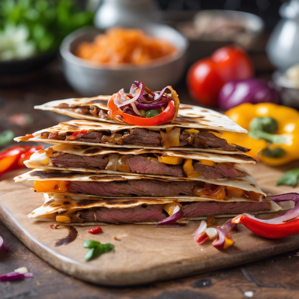 The Steak Quesadilla with caramelized onions and peppers is a mouthwatering fusion of Mexican and American flavors. This delectable dish features tender, juicy steak, savory caramelized onions, and vibrant peppers, all enveloped in a warm, gooey blanket of melted cheese, sandwiched between two crispy tortillas. Originating in the southwestern United States, this dish has become a beloved staple in Tex-Mex cuisine. Renowned chefs like Rick Bayless and Aaron Sanchez have put their own spin on this classic, elevating it to new heights. For the best version of this dish, head to renowned Tex-Mex eateries in Texas or Arizona, where skilled chefs expertly balance the flavors and textures. The key to a perfect Steak Quesadilla lies in the quality of the steak, the slow caramelization of the onions and peppers, and the gooey, melty cheese that binds it all together. Whether enjoyed as a hearty appetizer or a satisfying main course, this dish is a true crowd-pleaser, perfect for any occasion.