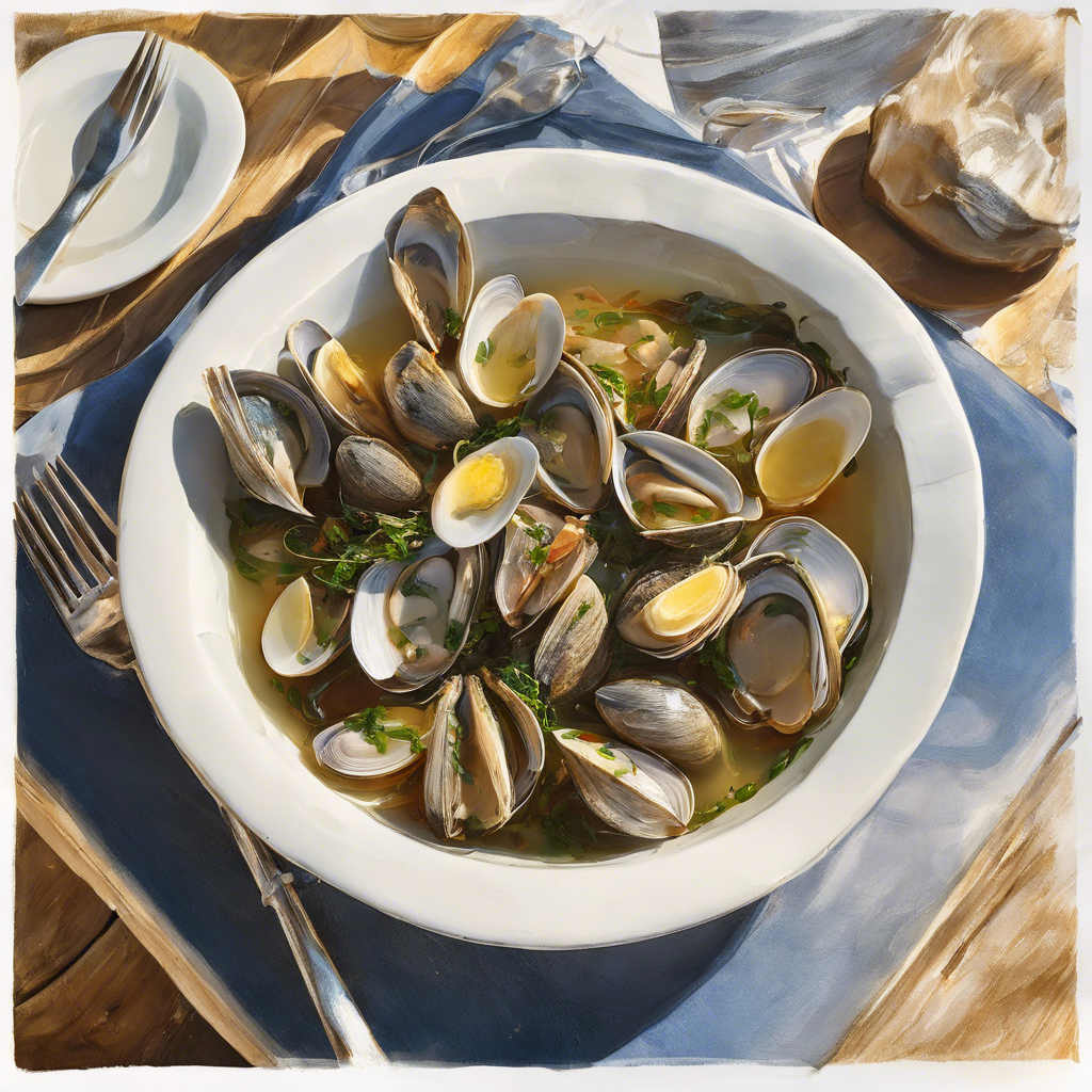 - Season the liquid with salt and pepper to taste, then pour it over the clams in the serving bowl.