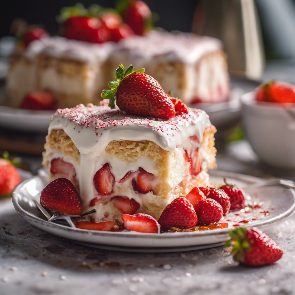 Strawberry Tres Leches is a delightful twist on the classic Latin American dessert. Originating in Mexico, Tres Leches cake is a sponge cake soaked in three types of milk - evaporated milk, condensed milk, and heavy cream. The addition of fresh strawberries adds a burst of fruity flavor and a pop of vibrant color to this beloved dessert. Renowned chefs like Pati Jinich and Marcela Valladolid have popularized this variation, infusing it with their own unique flair. For the best version of this dish, head to Mexico or any authentic Mexican restaurant where the cake is moist, the milk mixture perfectly sweet, and the strawberries fresh and juicy. Don't forget to let the cake soak up the milk mixture for the ultimate indulgence.