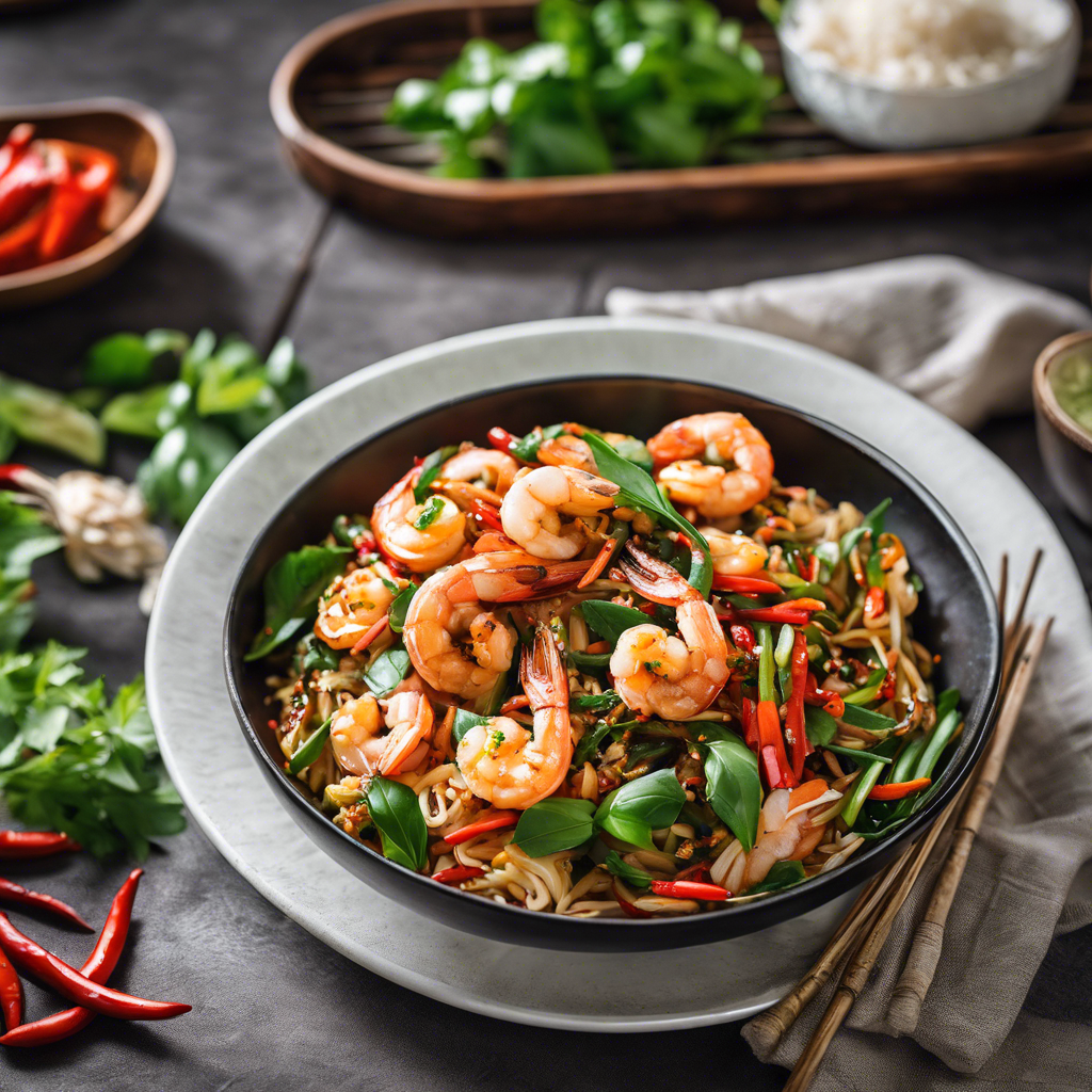 The Thai Basil Shrimp Stir-Fry with a spicy chili sauce is a tantalizing dish that originated in Thailand. This flavorful stir-fry is a perfect blend of succulent shrimp, aromatic Thai basil, and a fiery chili sauce. Renowned chefs in Thailand have perfected this dish, infusing it with their culinary expertise and traditional Thai flavors. The dish is popular in regions like Bangkok, where street vendors and local eateries serve up their own unique versions. The key to this dish lies in the balance of flavors, with the heat of the chili sauce complementing the freshness of the basil and the sweetness of the shrimp. For the best version of this dish, head to authentic Thai restaurants or street food stalls in Thailand. The essential elements to get right are the freshness of the shrimp, the pungent aroma of Thai basil, and the perfect balance of spicy chili sauce. This dish is a must-try for seafood lovers and those who crave a spicy kick in their stir-fry.