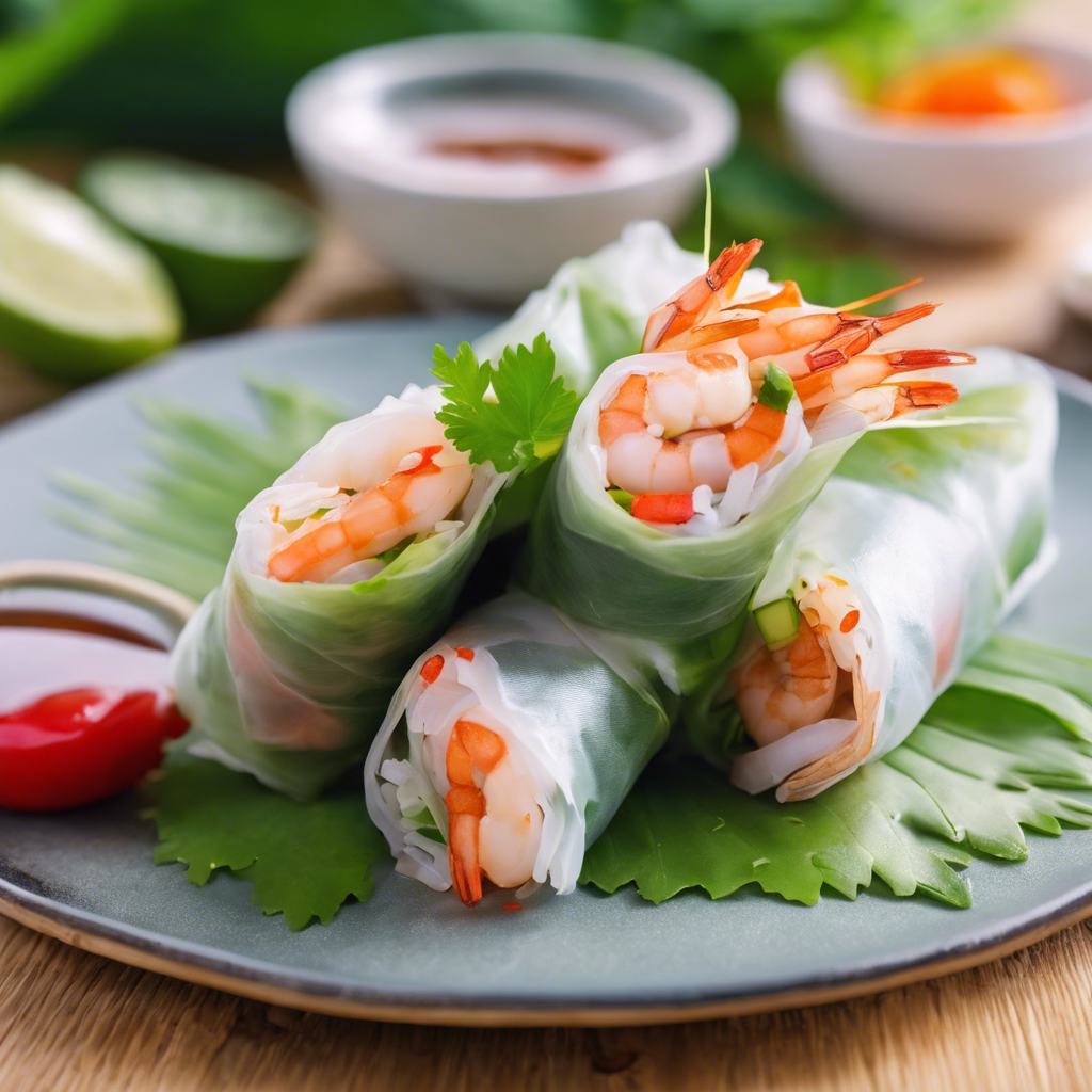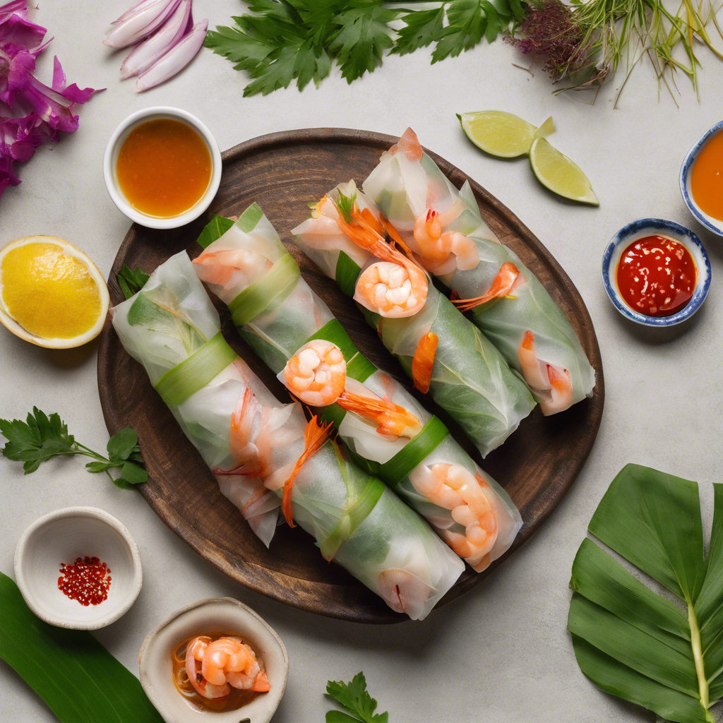 Thai Fresh Spring Rolls with added shrimp, also known as "Po Pia Sod Goong," are a popular dish in Thai cuisine. Originating in Thailand, these delectable rolls are a harmonious blend of fresh vegetables, herbs, and succulent shrimp, all wrapped in delicate rice paper. The dish is believed to have originated in the royal palaces of Thailand, where skilled chefs crafted these rolls as a symbol of elegance and refinement. Today, they are a staple in Thai restaurants worldwide. The key to a perfect Thai Fresh Spring Roll with shrimp lies in the freshness of the ingredients and the artful assembly, ensuring a delightful burst of flavors and textures in every bite. For the best version of this dish, seek out authentic Thai restaurants with experienced chefs who can expertly balance the flavors and textures. The essential elements to get right are the quality of the shrimp, the freshness of the vegetables, and the delicate balance of the dipping sauce. While the traditional method is widely cherished, there are also creative variations, such as adding unique herbs or infusing the shrimp with aromatic spices, that can elevate the dish to new heights.