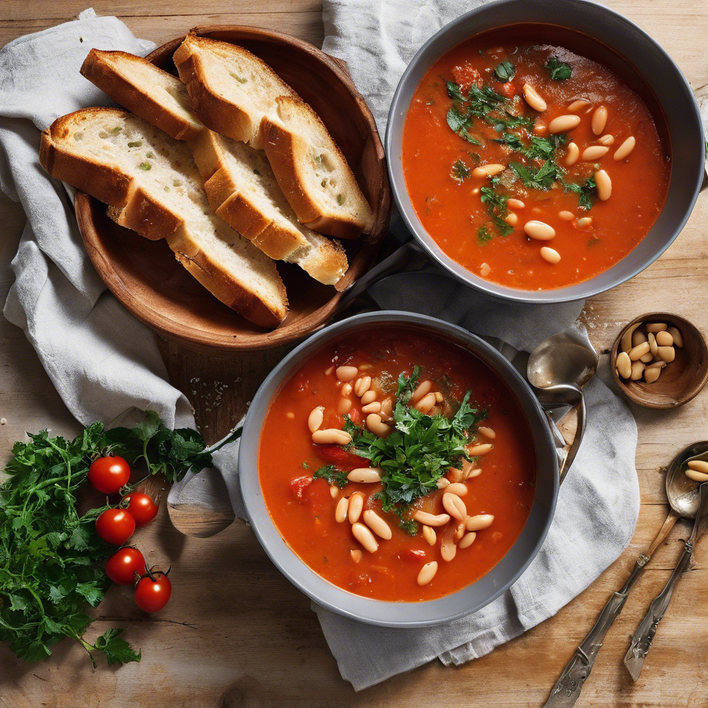 Tomato and White Bean Soup is a classic Italian dish that has been enjoyed for generations. This hearty and flavorful soup is a staple in Italian cuisine, known for its rich tomato base and creamy white beans. The dish is often seasoned with aromatic herbs like basil, oregano, and thyme, and finished with a drizzle of olive oil for a touch of richness. The history of this dish can be traced back to the rustic kitchens of Tuscany, where resourceful cooks would combine simple, affordable ingredients to create nourishing meals for their families. Today, Tomato and White Bean Soup can be found on the menus of Italian restaurants around the world, where chefs put their own unique spin on the classic recipe. One popular accompaniment to this comforting soup is a side of garlic bread. The warm, toasty slices of bread are infused with the bold flavors of garlic and butter, making them the perfect complement to the robust flavors of the soup. The combination of the soup and garlic bread creates a satisfying and comforting meal that is perfect for a cozy night in or a casual dinner with friends. When it comes to finding the best version of this dish, look for a restaurant that uses high-quality, ripe tomatoes and creamy white beans. The soup should be simmered low and slow to allow the flavors to meld together, resulting in a rich and satisfying bowl of comfort. As for the garlic bread, the key is to use fresh, crusty bread and to infuse it with plenty of garlic and butter for maximum flavor. For those looking to recreate this dish at home, consider adding a sprinkle of Parmesan cheese or a drizzle of balsamic glaze to elevate the flavors even further. Additionally, some chefs like to add a splash of white wine to the soup for a touch of acidity and complexity. Whether enjoyed at a cozy trattoria in Tuscany or in the comfort of your own kitchen, Tomato and White Bean Soup with a side of garlic bread is a timeless and comforting dish that is sure to warm the soul.