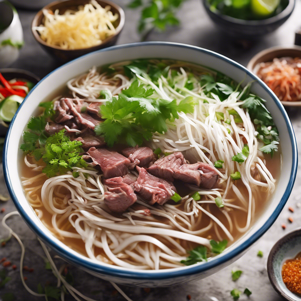 Traditional Beef Pho is a beloved Vietnamese dish with a rich history dating back to the early 20th century. This iconic soup is a harmonious blend of savory broth, tender beef, and delicate rice noodles, infused with aromatic spices like star anise, cinnamon, and cloves. The addition of extra bean sprouts and herbs enhances the dish with a refreshing crunch and vibrant flavors. Renowned chefs in Hanoi and Saigon have perfected their own unique variations of this classic recipe, each adding their personal touch to the dish. Today, the best versions of this dish can be found in authentic Vietnamese restaurants across the globe. The key to a perfect Beef Pho lies in the slow-simmered broth and the balance of spices, ensuring a depth of flavor that captivates the senses. For those seeking an alternative, some chefs recommend adding a splash of fish sauce for an extra umami kick. Whether enjoyed in a bustling street-side eatery in Vietnam or a cozy restaurant abroad, Traditional Beef Pho with extra bean sprouts and herbs is a culinary experience not to be missed.