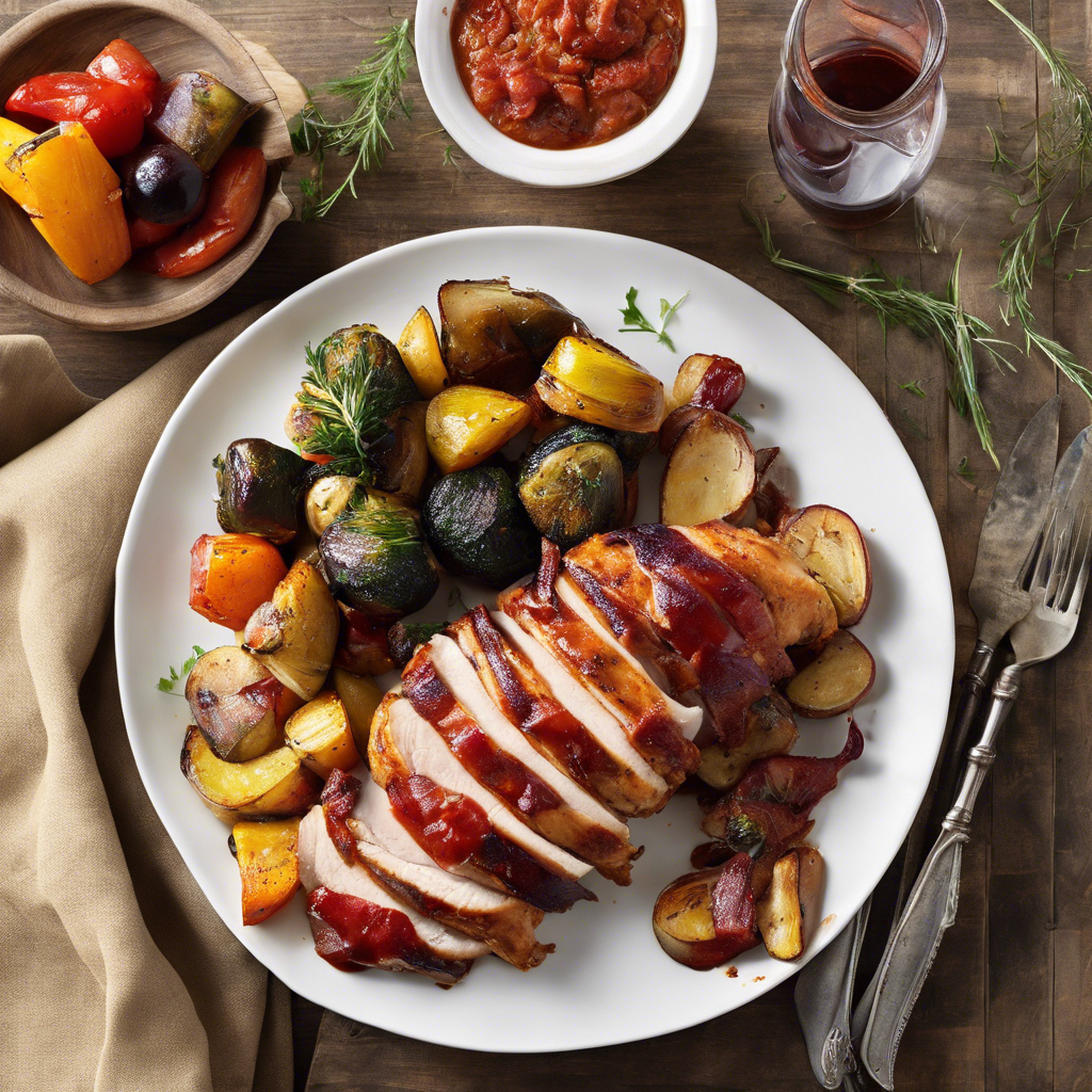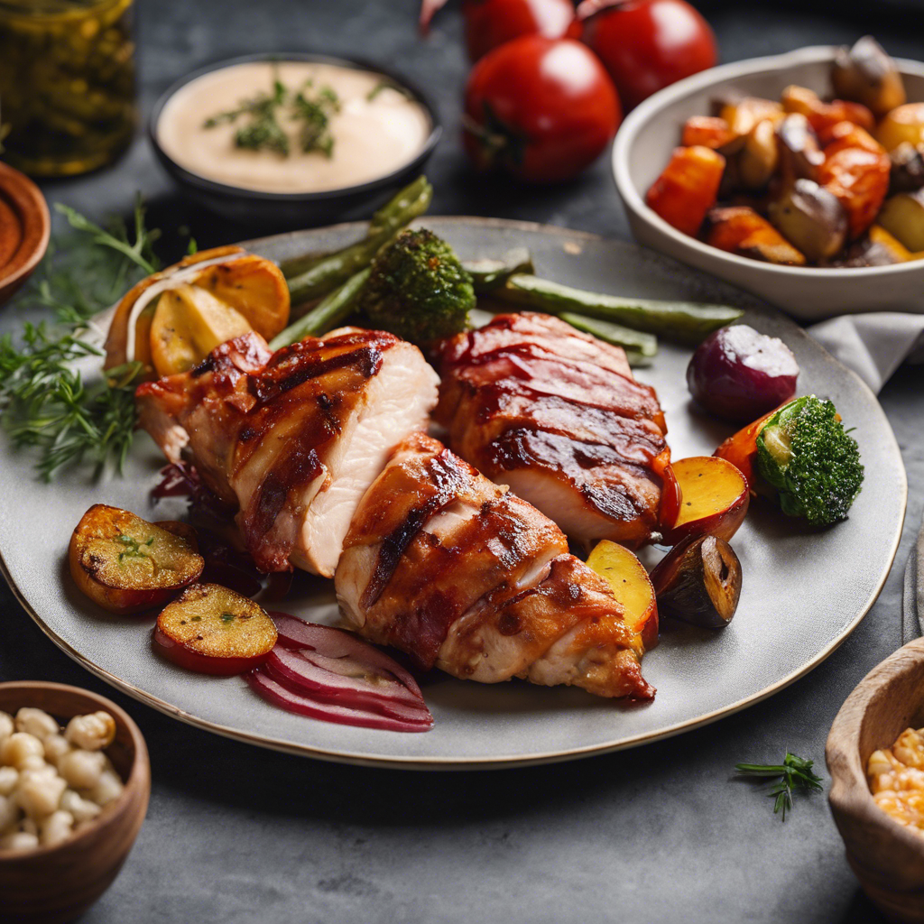 The Turkey Bacon Wrapped BBQ Stuffed Chicken Breast is a mouthwatering dish that combines the smoky flavors of turkey bacon and barbecue with the succulent tenderness of chicken breast. This dish has its roots in the southern United States, where barbecue is a way of life. The idea of stuffing the chicken breast with a savory filling and wrapping it in turkey bacon adds a unique twist to the traditional barbecue chicken. The side of roasted vegetables complements the dish with its earthy flavors and adds a healthy touch to the meal. One renowned chef known for perfecting this dish is Chef Bobby Flay, whose expertise in grilling and barbecue has made him a household name in the culinary world. His restaurant, Bar Americain, is famous for serving this delectable dish to eager food enthusiasts. The key to making this dish exceptional lies in the quality of the ingredients. The chicken breast should be tender and juicy, the turkey bacon should be crispy, and the barbecue sauce should be rich and flavorful. As for the roasted vegetables, a mix of colorful bell peppers, zucchini, and red onions roasted to perfection is essential to complete the meal. For those seeking the best version of this dish, visiting a renowned barbecue joint in the southern United States is a must. Alternatively, home cooks can experiment with different barbecue sauces and stuffing ingredients to create their own unique twist on this classic dish.