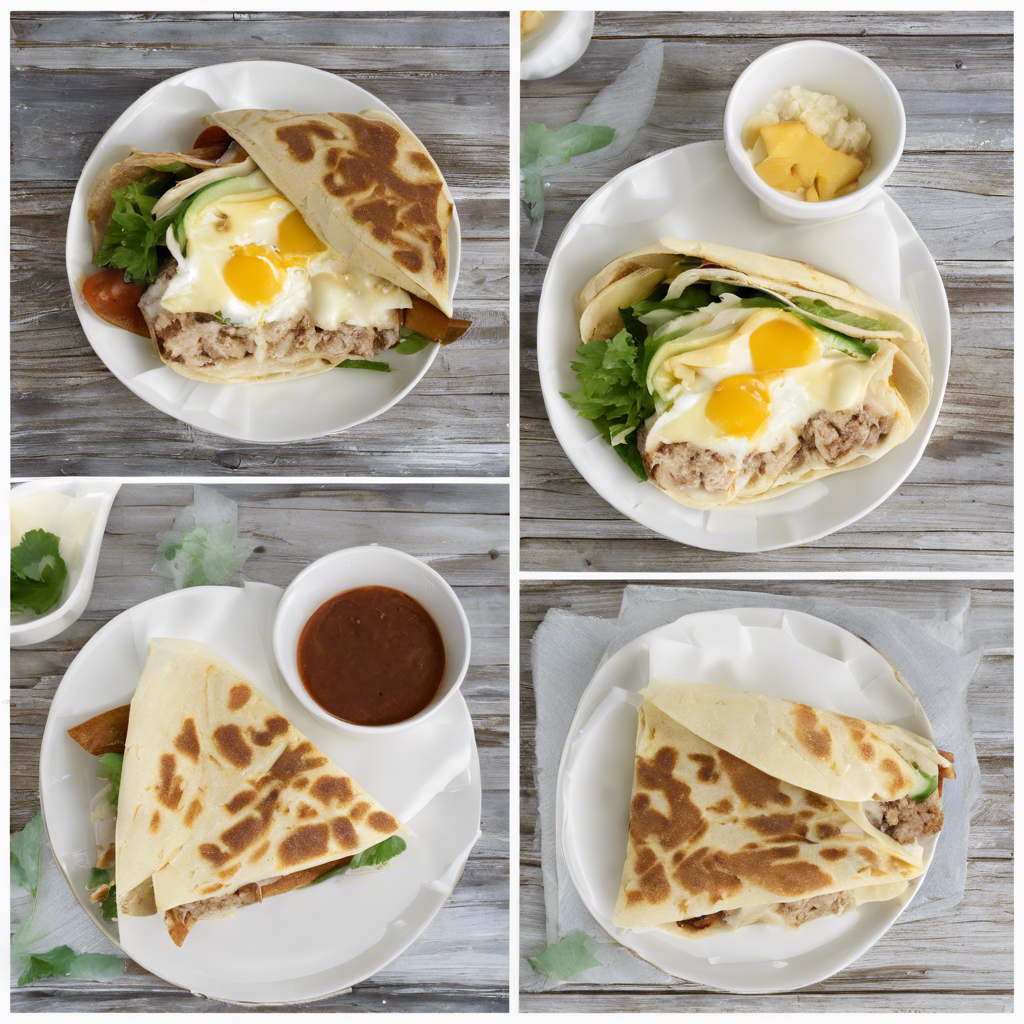 - Place the whole wheat tortilla on a flat surface. Place the cooked turkey sausage patties in the center of the tortilla, followed by the cooked egg whites, and shredded cheddar cheese.