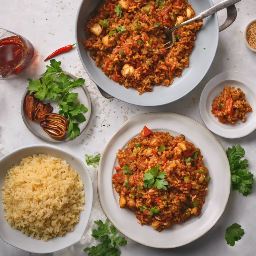 Vegetarian Spicy Jambalaya with cauliflower rice is a modern twist on the classic Creole dish. Originating in the southern United States, Jambalaya is a flavorful one-pot dish with a mix of African, French, and Spanish influences. The use of cauliflower rice instead of regular rice adds a low-carb, gluten-free alternative to this beloved recipe. Renowned chefs like Emeril Lagasse and Paul Prudhomme have popularized Jambalaya, and today, it's a staple in New Orleans and Louisiana cuisine. The key to a delicious Vegetarian Spicy Jambalaya lies in the perfect blend of spices, including cayenne pepper, paprika, and thyme, to create that signature Creole flavor. For the best version of this dish, head to authentic Creole restaurants in New Orleans, where chefs expertly craft this spicy, satisfying dish.