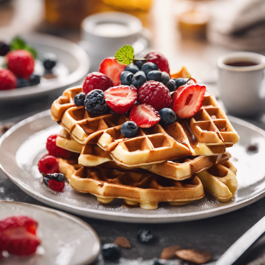 - To assemble the waffle stack, place one waffle on a plate, top with a handful of fresh berries, then drizzle with maple syrup. Repeat with another waffle, berries, and syrup. Continue until you have a stack of 4 waffles.