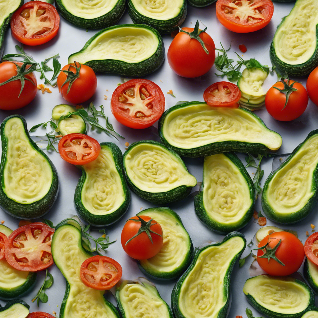 - Arrange the zucchini and tomato slices in the prepared baking dish, alternating and overlapping them in rows.